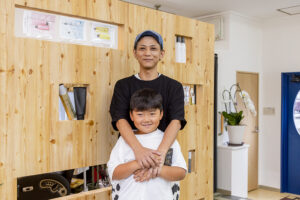合志市美容室の中でも珍しく、ベビーカーのままセット面の横まで入店可能な設計になっています。お子様の顔を見ながら施術を受けられるので、安心してリラックスした時間をお過ごしいただけます。もちろん、キッズカットも承っておりますので、親子でのご来店も心よりお待ちしております。